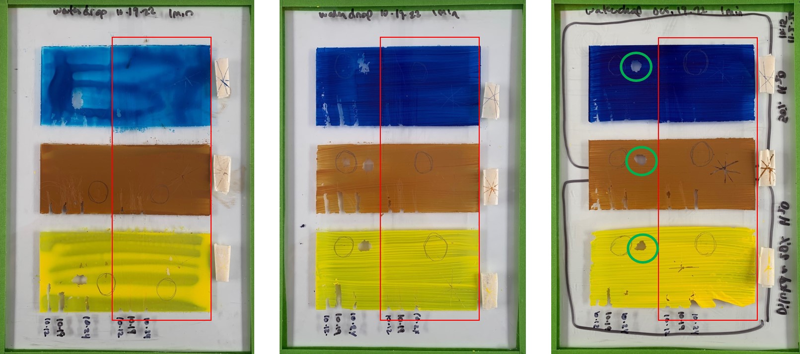 We put a drop of water onto the paint over the glass and GAC 200 and let it dwell for 1 minute, then wiped off the water and swiped a palette knife over that area. The paint immediately came off over the glass in the shape of the water drop, but stayed locked down over the GAC 200 clear primer. The only exception was High Flow Raw Sienna, which did not come off in either case. We did the same water drop test, but let it dwell overnight. When we came back the next day, it was dry and the knife swipe did not lift any color from the glass or GAC 200. Finally, we did an adhesion test over the GAC 200, which did not show any failure. The tape can be seen on the right edge of the glass with color coming off only where the knife cut through the film, which is standard even for excellent adhesion. Though we had good results with this round of adhesion testing, the lab at Golden Artist Colors has seen cross-hatch adhesion failure with different paint lines over GAC 200 used as a clear primer after about 2 weeks dry time. Their failure may have been due to increased humidity in the Lab. This adhesion test was performed one month after application, in a low humidity environment which seems to indicate that adhesion improves with time and in lower relative humidity.