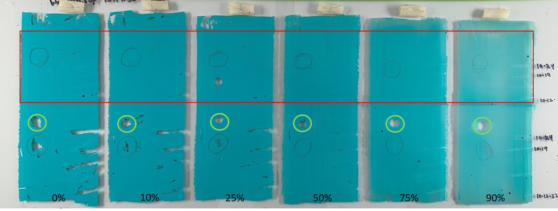 This panel shows Fluid Teal modified with GAC 200 – 0%, 10%, 25%, 50%, 75% and 90% by weight, to determine at what ratio the GAC 200 starts to benefit durability and adhesion.