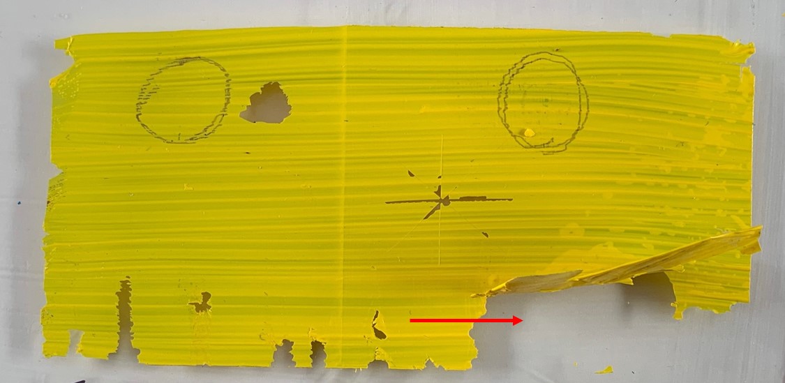 It should be mentioned, that scratching from the edge of a paint area is the easiest way to get a failure. Most of these applications are fairly difficult to scratch starting from the middle. Failed adhesion on glass usually happens when the knife or finger nail gets under the film and can peel it from the surface. Heavy Body Benzimidazolone Yellow Light (depicted below) did peel off in the corner during early testing when the knife caught the edge of the paint application over GAC 200.