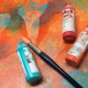 Free-flowing liquid paints and mediums are at the heart of the pouring process. Adjusting the viscosity and flow rate to work in tandem with how you want the paints to interact with each other is key. Obviously, products like GOLDEN Fluid Acrylics and High Flow Acrylics are more practical when doing pours than thicker Heavy Body Acrylics. This is not to say you cannot use Heavy Body paints, but they will first require thinning with water, acrylic medium, or both. A great approach for thinning Heavy Body paints without a loss of film strength is to first mix a thin acrylic medium such as GAC 100 with water (1 part medium to 1.5 parts water, and then use this mixture to thin the paints as much as desired). This mixture assures quick thinning but contains enough acrylic binder so that you still end up with a pourable paint instead of a color stain mixture. Since Fluids and High Flow Acrylics are already pourable, this step isn’t required to work with them, but sometimes it is necessary to adjust these paints as well. GOLDEN Airbrush Transparent Extender is also a valuable medium for adjusting paints. This product is a similar consistency to High Flow Acrylics, containing flow improvers and leveling additives.